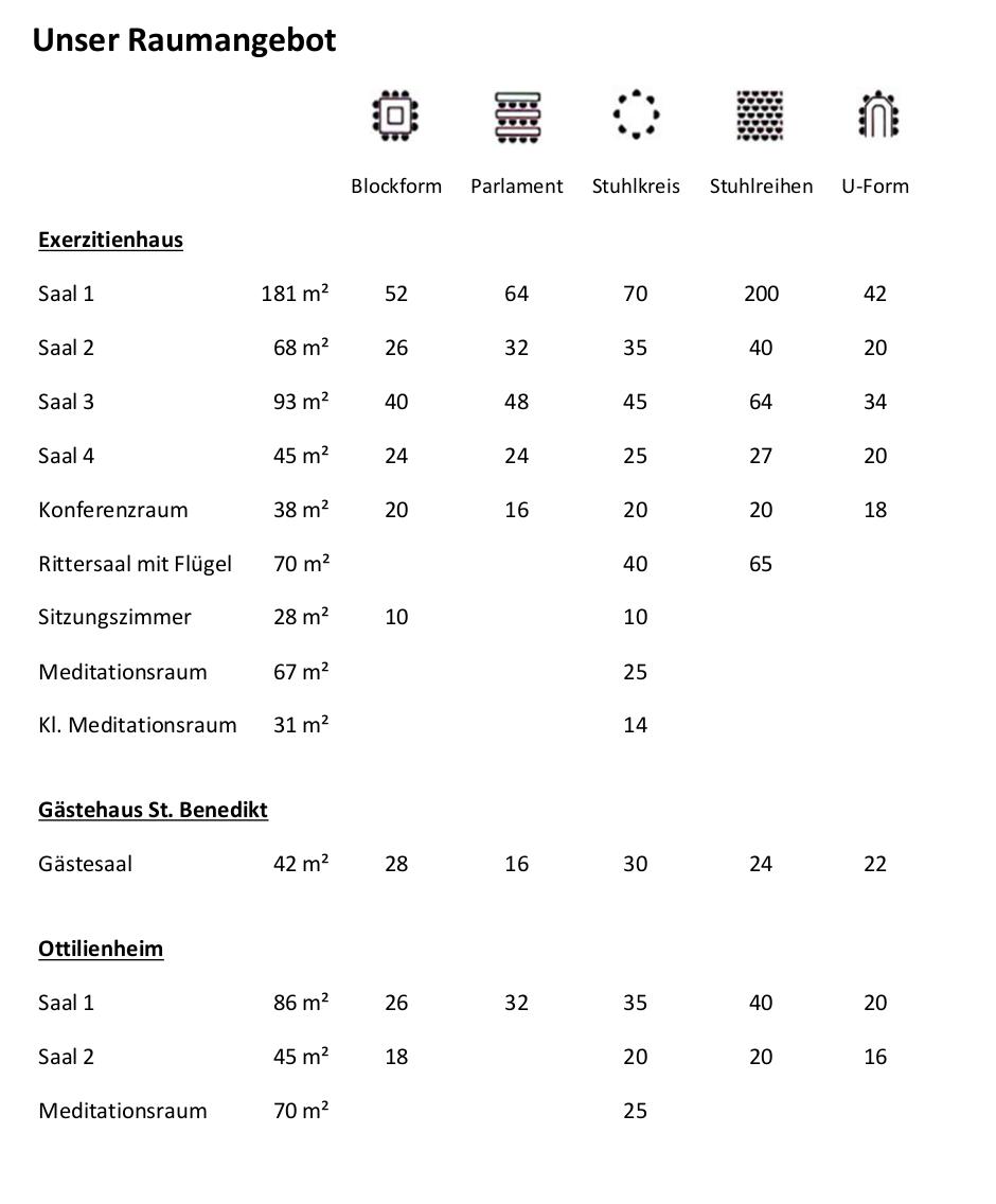 Verschiedene Tagungsräume des Exerzitien- und Gästehauses St. Ottilien stehen nach Belegungskapazität auch Gruppen und Einrichtungen zur Verfügung. Mit 151 Betten & 13 Tagungsräumen zwischen 28 und 181 qm, bietet unser Haus eine Vielzahl an Möglichkeiten, um Ihre Veranstaltung individuell zu gestalten.